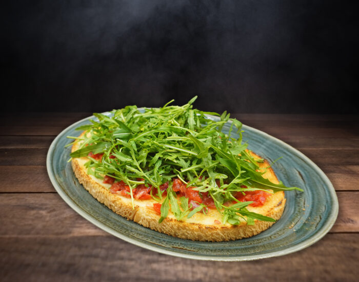 knusprig geröstetes Weißbrot mit Knoblauch, bestem Olivenöl und marinierten Tomaten