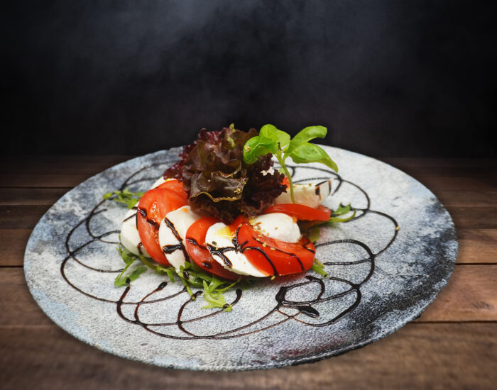 Büffelmozzarella und Cherrytomaten auf Rucola-Salat mit Aceto Balsamico und Olivenöl