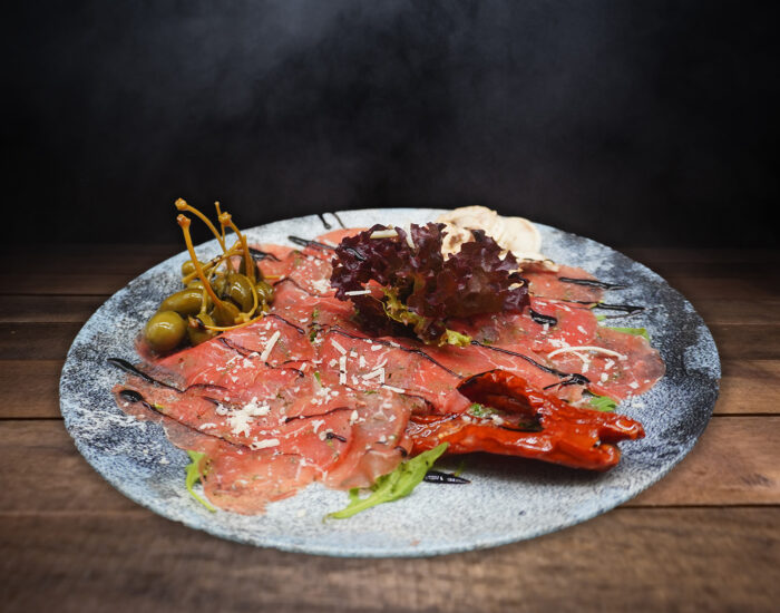 hauchdünnes Rinderfilet, Rucola, Grana Padano, Pilze, getrocknete Tomaten, Kapern