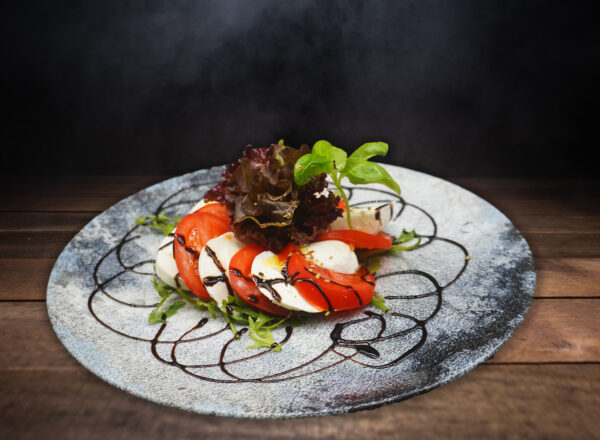 Büffelmozzarella und Cherrytomaten auf Rucola-Salat mit Aceto Balsamico und Olivenöl