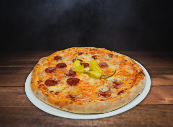 Tomaten, Mozzarella, scharfe Salami, Pfefferoni, Knoblauch