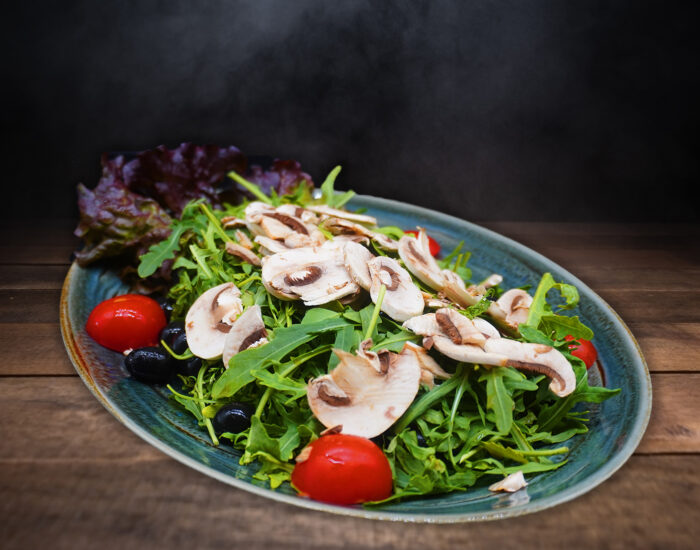 Schafskäse, Grana Padano Späne, Oliven, Artischocken, milde Pfefferoni und Cherrytomaten auf Rucola und grünem Salat mit Balsamicodressing