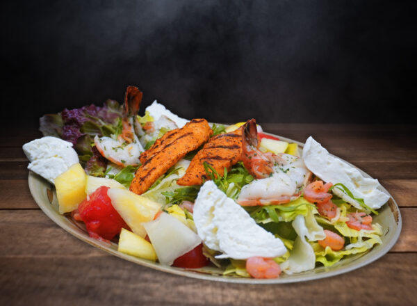 gegrilltes Hühnerfilet und Scampi auf Rucola und grünem Salat, frische Früchte, Mozzarella, Cherrytomaten, Zwiebeln und Balsamicodressing