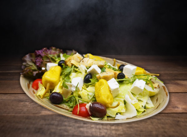 Schafskäse, Grana Padano Späne, Oliven, Artischocken, milde Pfefferoni und Cherrytomaten auf Rucola und grünem Salat mit Balsamicodressing