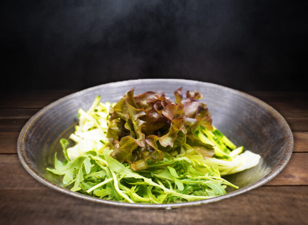 gegrilltes Hühnerfilet und Scampi auf Rucola und grünem Salat, frische Früchte, Mozzarella, Cherrytomaten, Zwiebeln und Balsamicodressing