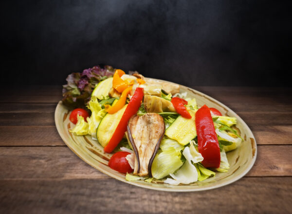 pikantes Grillgemüse auf Rucola und grünem Salat, Grana Padano Späne, Knoblauchöl und Balsamico