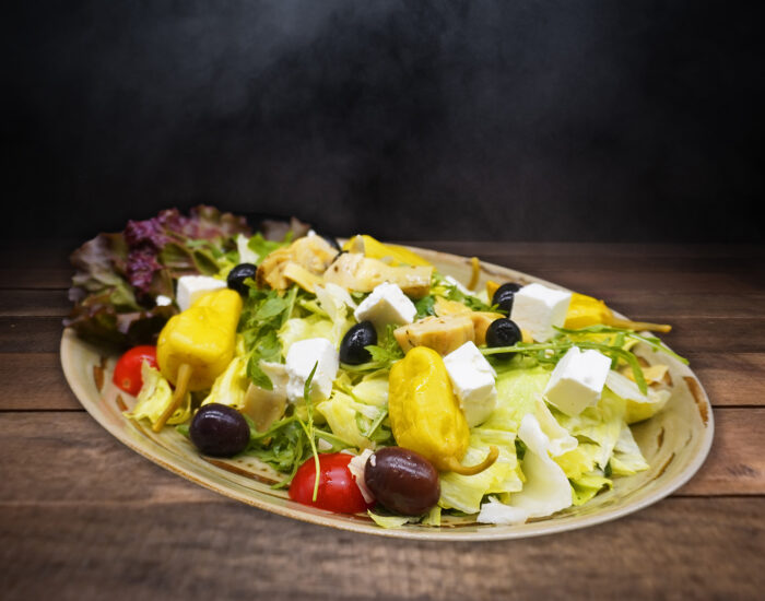 Schafskäse, Grana Padano Späne, Oliven, Artischocken, milde Pfefferoni und Cherrytomaten auf Rucola und grünem Salat mit Balsamicodressing